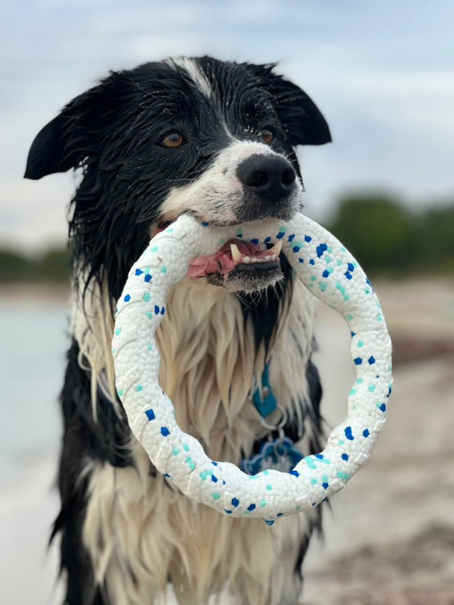 BEACH RING: Your pup will have endless fun with this Astro Ring.... ideal for beach days or backyard adventures. Whether you're tossing it like a frisbee or playing tug, this ring is made from eco-friendly material, it is built to last and very durable. Its chewy, lightweight and easy to clean !
